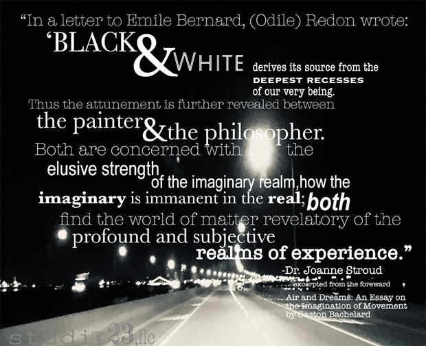 Black and white. The elusive strength of the imaginary realm. There are possibilities in one simple contrast to consider. Lately, elusiveness seems to spill into everything. If you’ve never read anything by Gaston Bachelard, he really can bend your mind…or at least gift you with an alternate perspective. Here’s the text that prompted this: