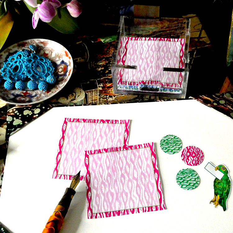 Ikat patterned square notepaper in several cheerful colors make for a chic addition to your desk.