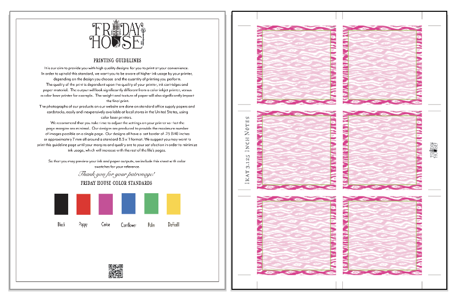 Our Ikat pattern, which coordinates with our Parrot collection pieces, is available here in various cheerful colors in a square note paper. It’s one of my personal favorites and I love the chic feeling it gives my desk. Like many of our printable files, this can be used however your imagination leads.