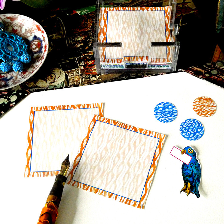 Ikat patterned square notepaper in several cheerful colors make for a chic addition to your desk.