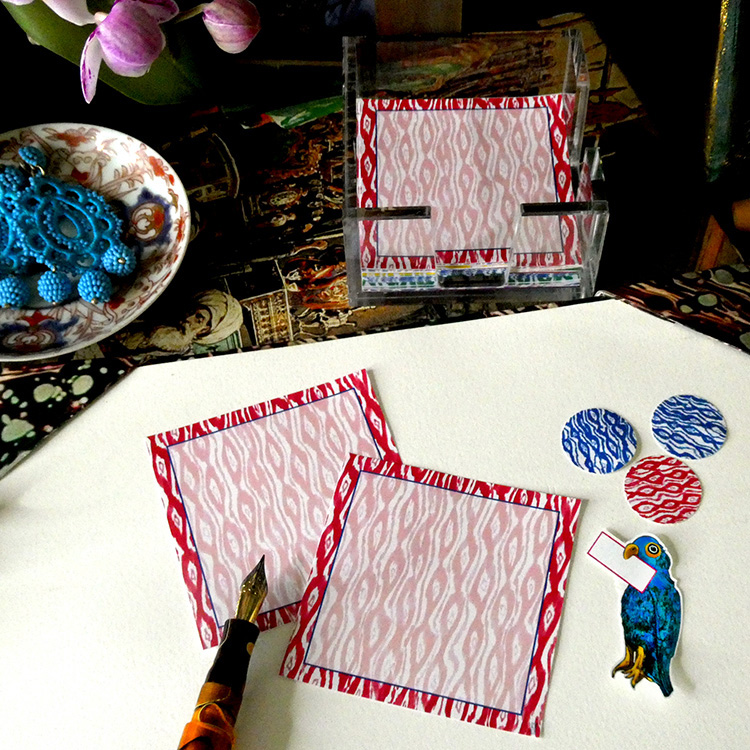 Ikat patterned 5×7 note cards in several cheerful colors with coordinating e make for a chic addition to your desk.