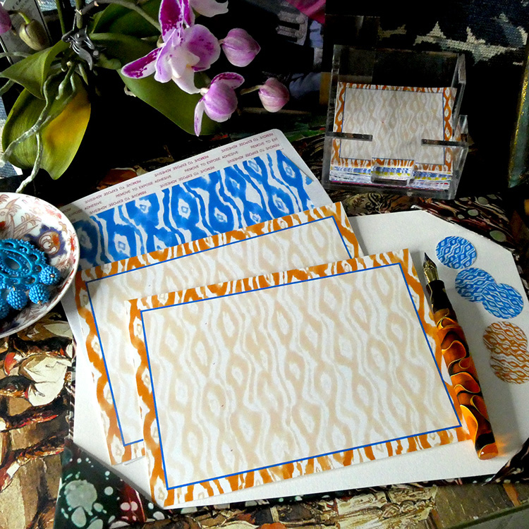 Our Ikat pattern, which coordinates with our Parrot collection pieces, is available here in various cheerful colors in 5×7 notecards with coordinating envelope liners to add some verve to your correspondence.Of course, like many of our designs, these can be used however your imagination leads.