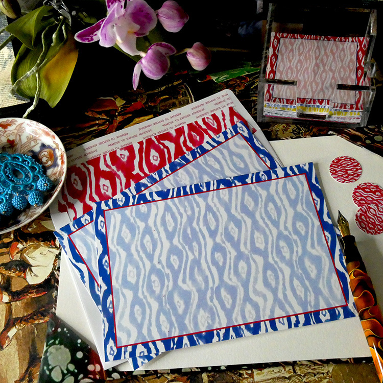 Ikat patterned 5×7 note cards in several cheerful colors with coordinating e make for a chic addition to your desk.