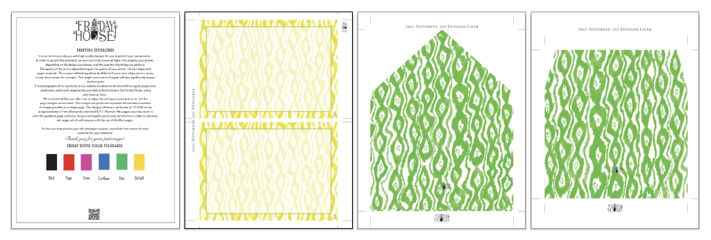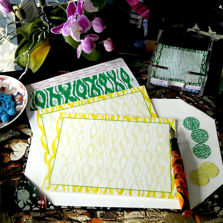 Ikat patterned 5×7 note cards in several cheerful colors with coordinating e make for a chic addition to your desk.