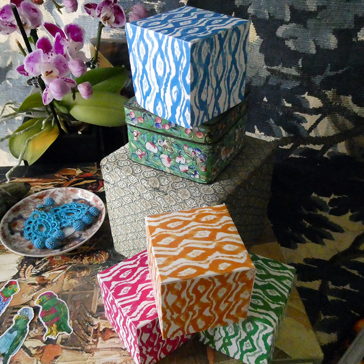Ikat patterned square notepaper in several cheerful colors make for a chic addition to your desk.