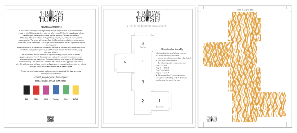 Good things come in small packages, emphasis here on the small packaging. These attractively patterned 2.25″ favor boxes definitely fit that bill. These small square boxes will bring a tiny bit of delight and enhance your party, gathering, table setting, Christmas stocking or Holiday giving, lunch box, suitcase or anywhere else you can think to use a little gift to bring some sweetness. We suggest printing on card stock and include easy assembly instructions, or watch the video tutorial.
