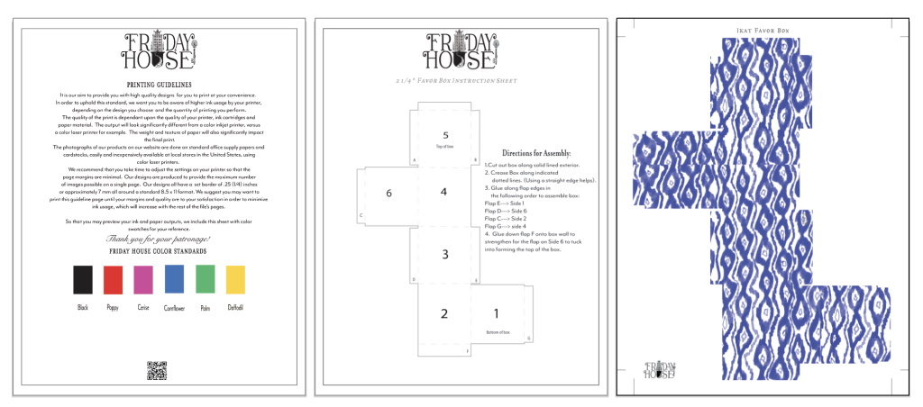 Good things come in small packages, emphasis here on the small packaging. These attractively patterned 2.25″ favor boxes definitely fit that bill. These small square boxes will bring a tiny bit of delight and enhance your party, gathering, table setting, Christmas stocking or Holiday giving, lunch box, suitcase or anywhere else you can think to use a little gift to bring some sweetness. We suggest printing on card stock and include easy assembly instructions, or watch the video tutorial.