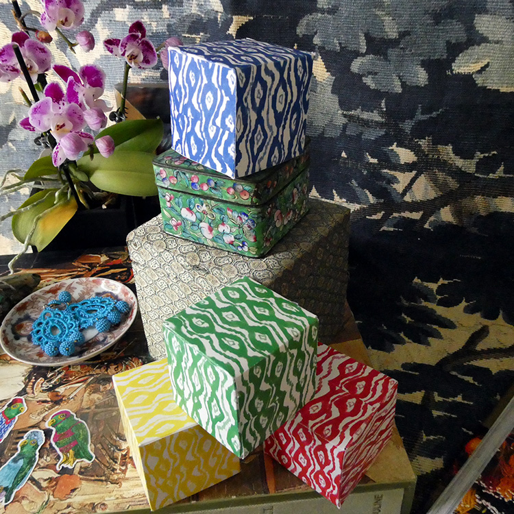 Ikat patterned 5×7 note cards in several cheerful colors with coordinating e make for a chic addition to your desk.