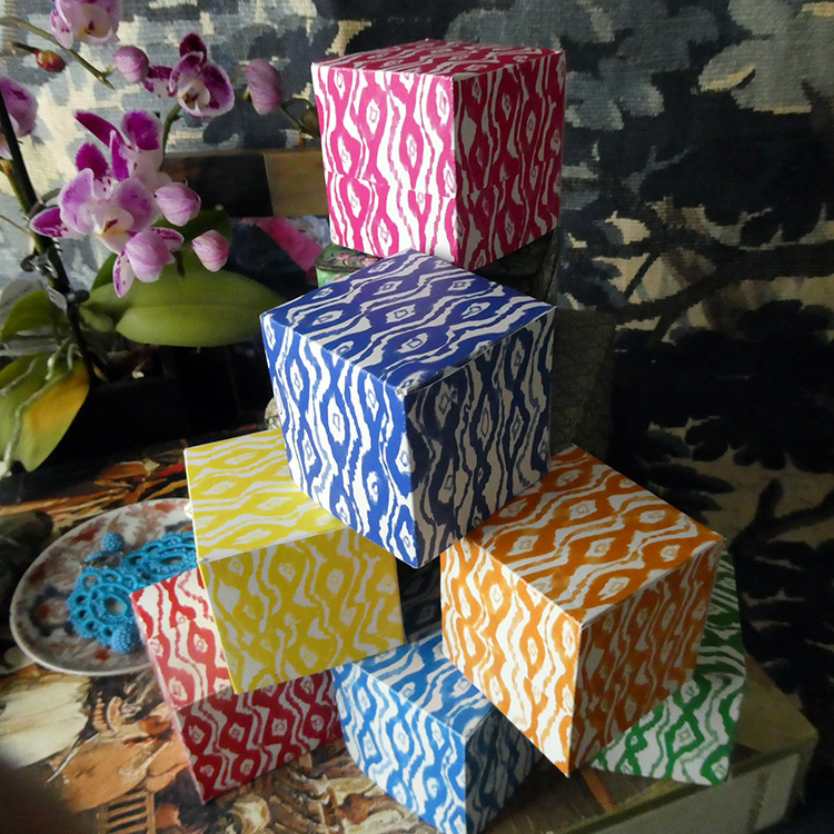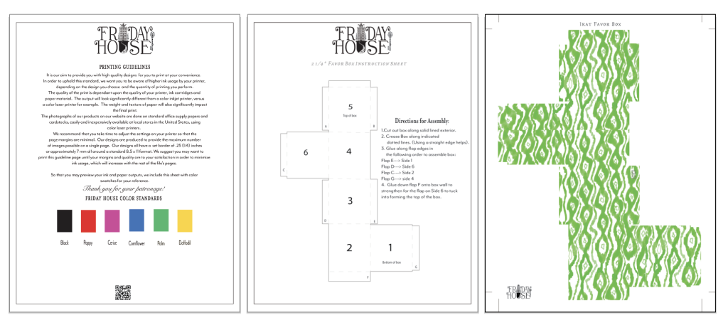Good things come in small packages, emphasis here on the small packaging. These attractively patterned 2.25″ favor boxes definitely fit that bill. These small square boxes will bring a tiny bit of delight and enhance your party, gathering, table setting, Christmas stocking or Holiday giving, lunch box, suitcase or anywhere else you can think to use a little gift to bring some sweetness. We suggest printing on card stock and include easy assembly instructions, or watch the video tutorial.