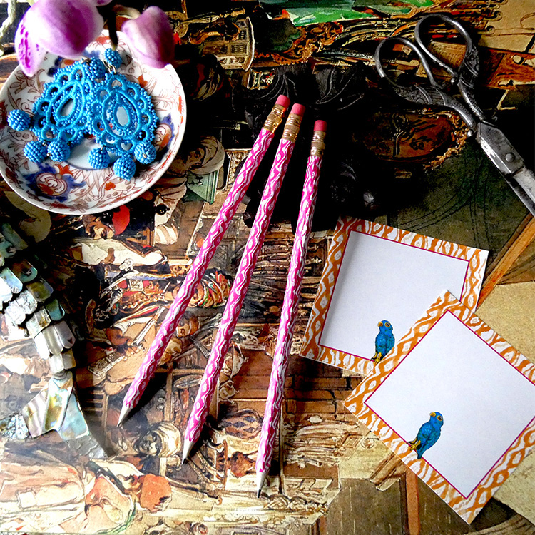 Our Ikat pattern, which coordinates with our Parrot collection pieces, is available here in various cheerful colors in perfectly sized rectangles to fit around pencils, to give your desk a lovely decorative detail. These can also make some wonderful bookmarks. Instructions included in the file, or watch the tutorial videon. Each page you print will provide eight covered pencils. We suggest you use a regular 20 lb. bond weight paper to print on, as this forms well around the pencils.