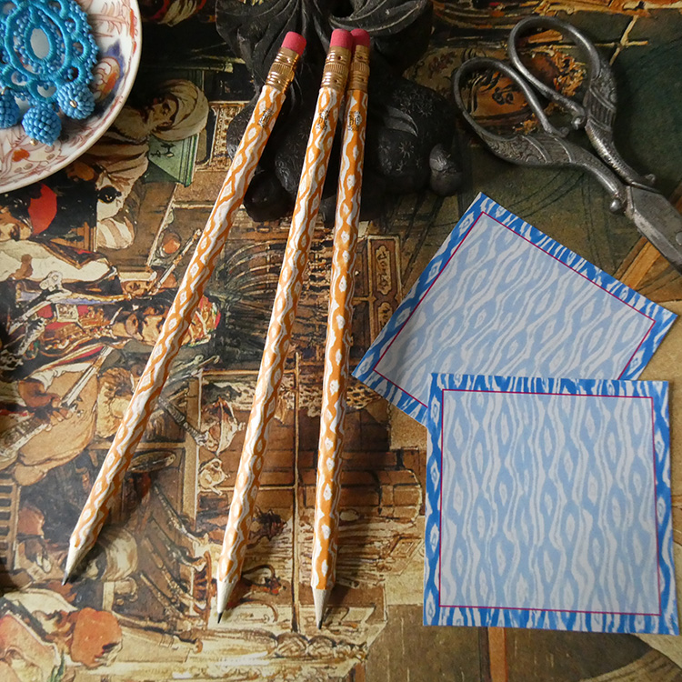 Our Ikat pattern, which coordinates with our Parrot collection pieces, is available here in various cheerful colors in perfectly sized rectangles to fit around pencils, to give your desk a lovely decorative detail. These can also make some wonderful bookmarks. Instructions included in the file, or watch the tutorial videon. Each page you print will provide eight covered pencils. We suggest you use a regular 20 lb. bond weight paper to print on, as this forms well around the pencils.