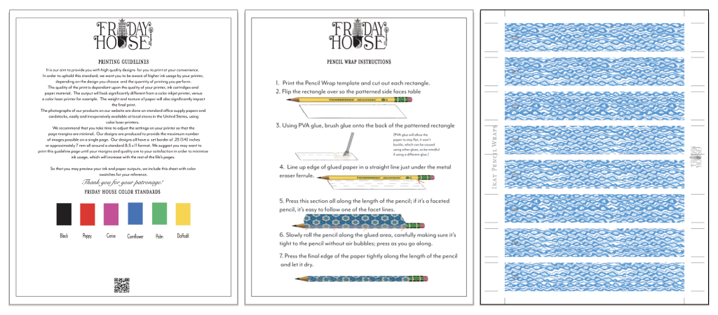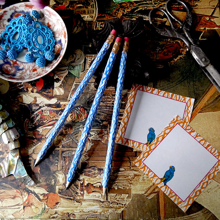 Our Ikat pattern, which coordinates with our Parrot collection pieces, is available here in various cheerful colors in perfectly sized rectangles to fit around pencils, to give your desk a lovely decorative detail. These can also make some wonderful bookmarks. Instructions included in the file, or watch the tutorial videon. Each page you print will provide eight covered pencils. We suggest you use a regular 20 lb. bond weight paper to print on, as this forms well around the pencils.