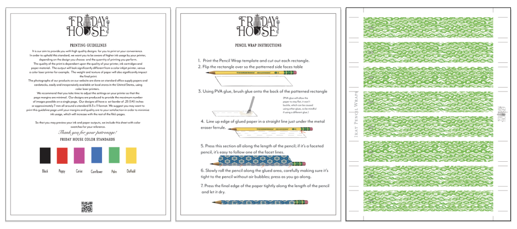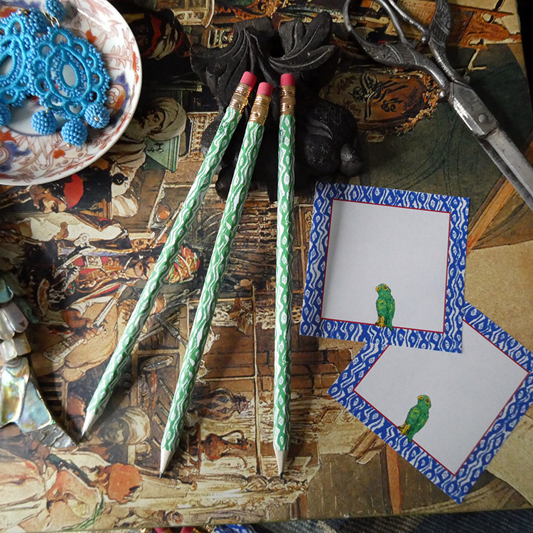 Our Ikat pattern, which coordinates with our Parrot collection pieces, is available here in various cheerful colors in perfectly sized rectangles to fit around pencils, to give your desk a lovely decorative detail. These can also make some wonderful bookmarks. Instructions included in the file, or watch the tutorial videon. Each page you print will provide eight covered pencils. We suggest you use a regular 20 lb. bond weight paper to print on, as this forms well around the pencils.