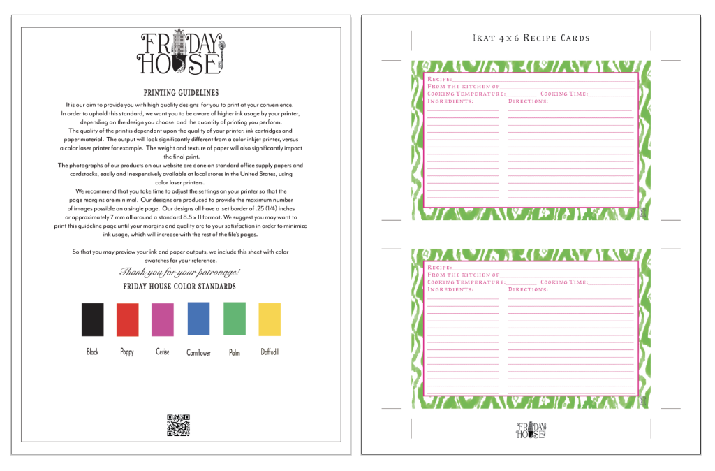 Our Ikat Collection is so cheerful, we’ve done some bordered recipe cards in two sizes, 4×6 and 5×7, and three colors; indigo blue, lettuce green, and carrot orange.