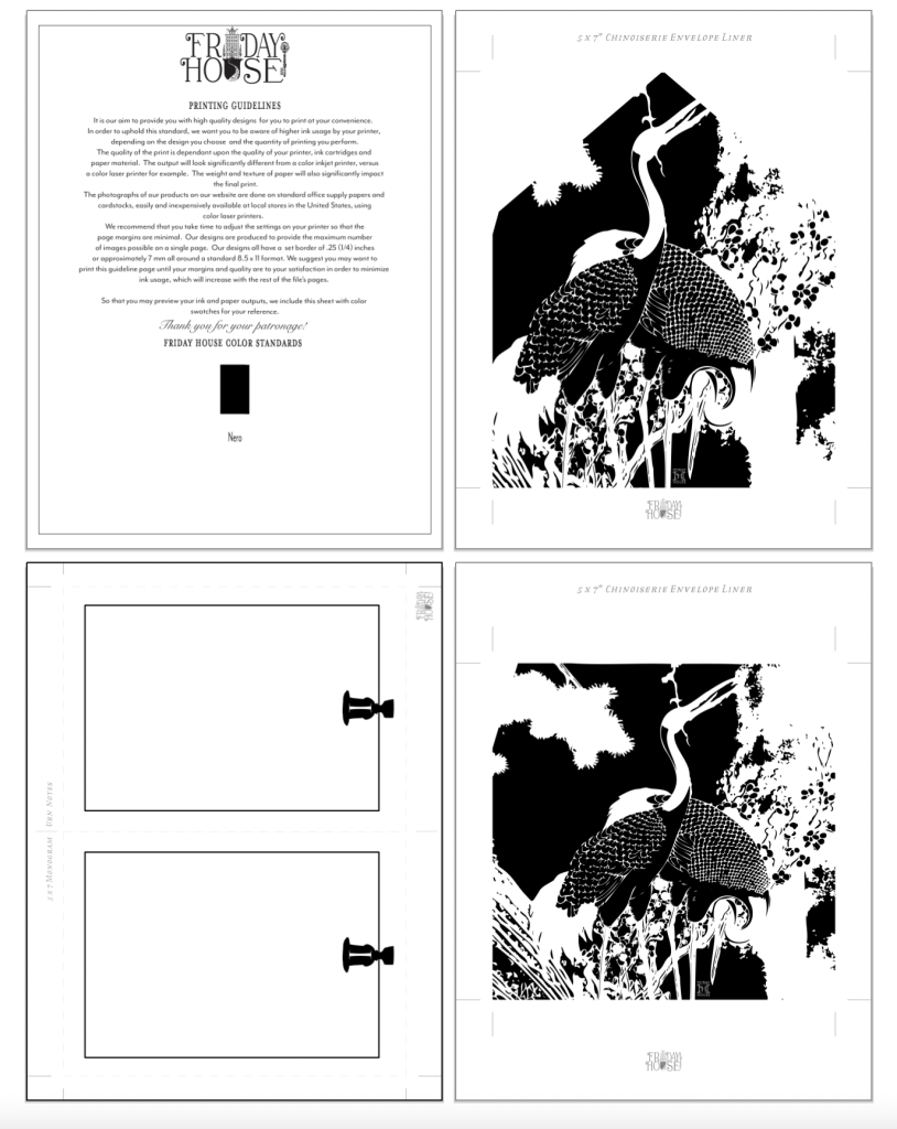 Using a whimsical garden planter silhouette as the background for a monogram, these thinly bordered notes are paired with envelope liners featuring a crane motif inspired by a lacquer screen in our collection. These notecards are available in Blush/Cerise Pink, Eau de Nil/Delft Blue, Lemon/Chartreuse, and Black/Paper, which lends itself to being printed on a wide variety of papers and colors. The crane design is also available in coordinating products such as double sided place cards/gift tags, fortune cookies, clover envelope, favor boxes, valet tray, and notebook covers.