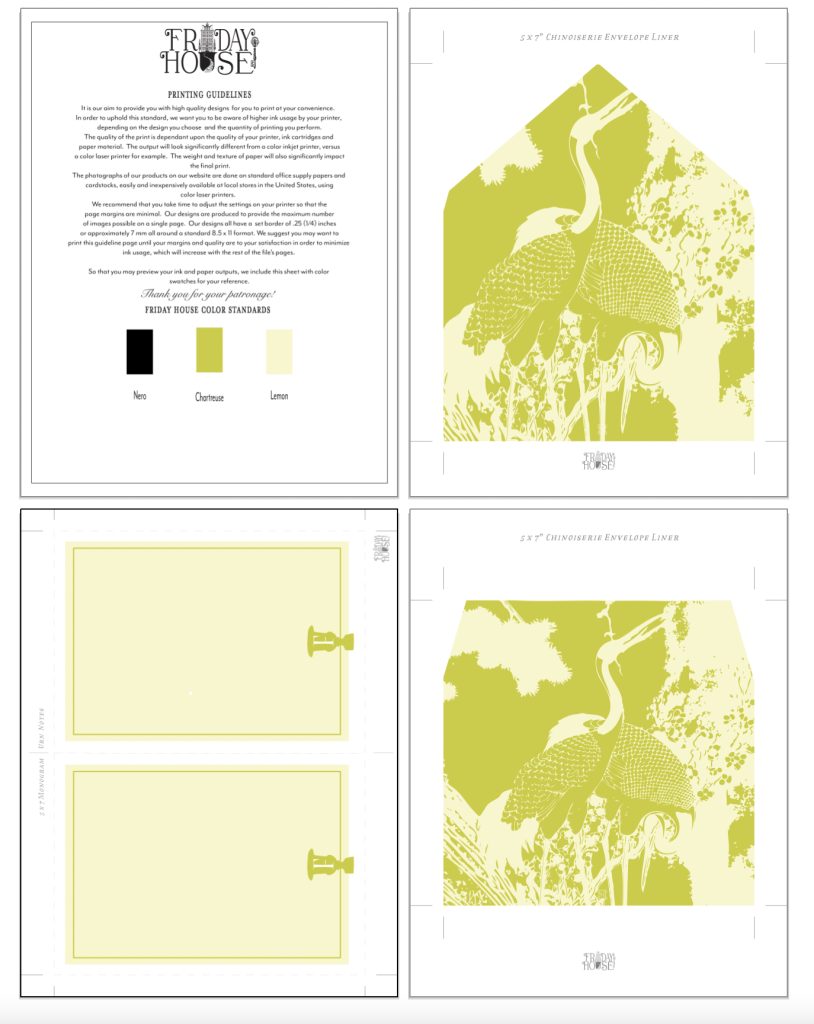Using a whimsical garden planter silhouette as the background for a monogram, these thinly bordered notes are paired with envelope liners featuring a crane motif inspired by a lacquer screen in our collection. These notecards are available in Blush/Cerise Pink, Eau de Nil/Delft Blue, Lemon/Chartreuse, and Black/Paper, which lends itself to being printed on a wide variety of papers and colors. The crane design is also available in coordinating products such as double sided place cards/gift tags, fortune cookies, clover envelope, favor boxes, valet tray, and notebook covers.