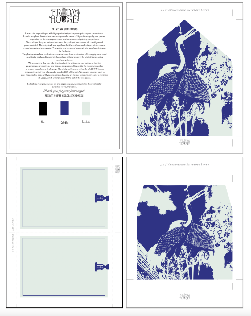 Using a whimsical garden planter silhouette as the background for a monogram, these thinly bordered notes are paired with envelope liners featuring a crane motif inspired by a lacquer screen in our collection. These notecards are available in Blush/Cerise Pink, Eau de Nil/Delft Blue, Lemon/Chartreuse, and Black/Paper, which lends itself to being printed on a wide variety of papers and colors. The crane design is also available in coordinating products such as double sided place cards/gift tags, fortune cookies, clover envelope, favor boxes, valet tray, and notebook covers.