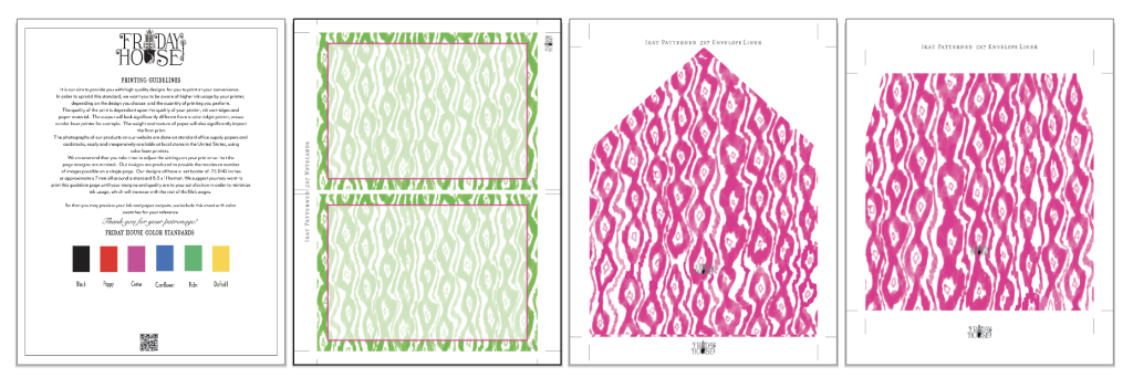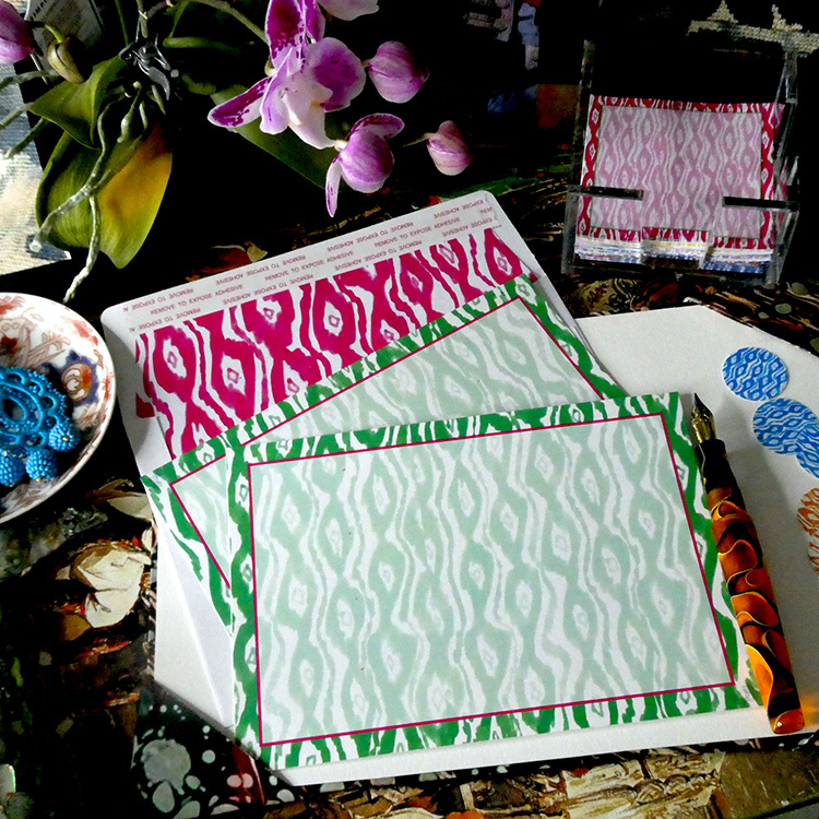 Ikat patterned 5×7 note cards in several cheerful colors with coordinating e make for a chic addition to your desk.