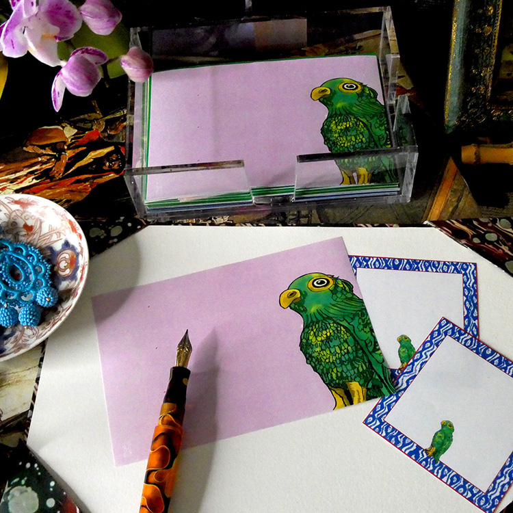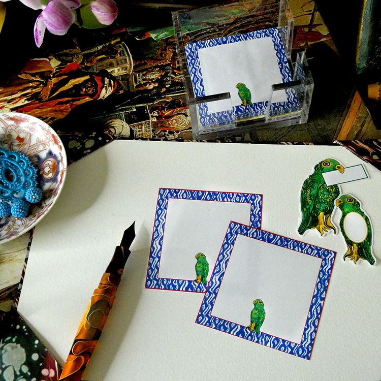I have long been intrigued by Sancai Parrots, which are antique earthenware parrots made in the nineteenth century in northern China. Frequently they were used as incense burners in temples. I drew some parrots based on these delightful antiques and the Parrot Collection resulted. We added some notepapers starting with these ikat bordered squares featuring our small parrots in the center. Of course, like many of our designs, these can be used however your imagination leads.