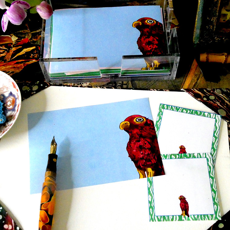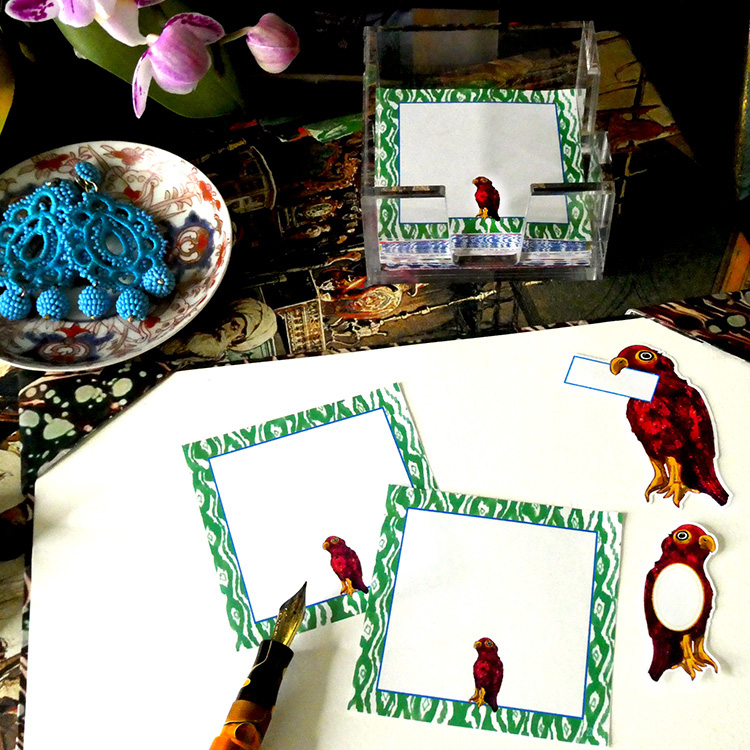 I have long been intrigued by Sancai Parrots, which are antique earthenware parrots made in the nineteenth century in northern China. Frequently they were used as incense burners in temples. I drew some parrots based on these delightful antiques and the Parrot Collection resulted. We added some notepapers starting with these ikat bordered squares featuring our small parrots in the center. Of course, like many of our designs, these can be used however your imagination leads.