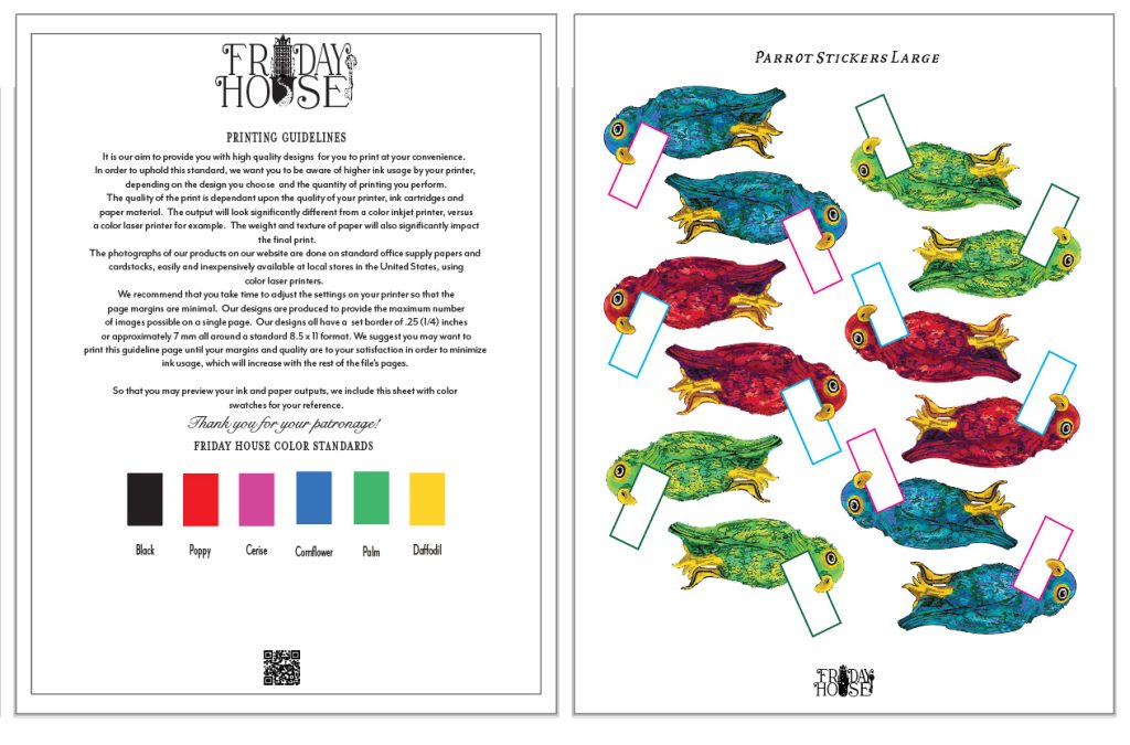 I have long been intrigued by Sancai Parrots, which are antique earthenware parrots made in the nineteenth century in northern China. Frequently they were used as incense burners in temples. I drew some parrots based on these delightful antiques and the Parrot Collection resulted. We added a variety of labels and stickers to this collection. Of course, like many of our designs, these can be used however your imagination leads. We recommend using sticker paper for labels, or cardstock paper for tags.
