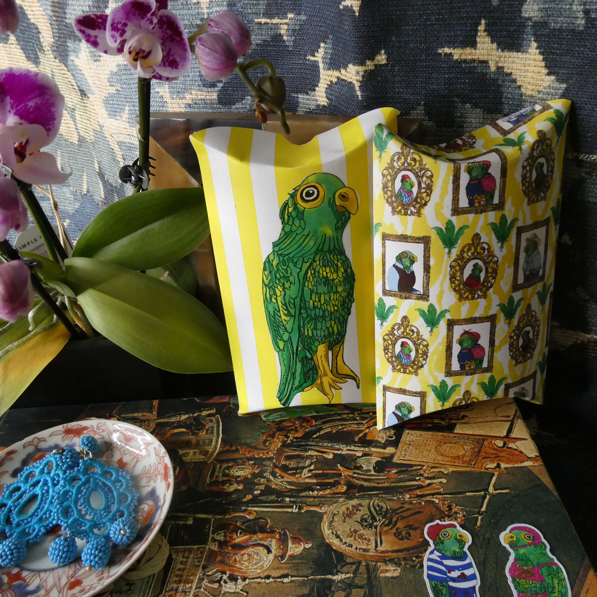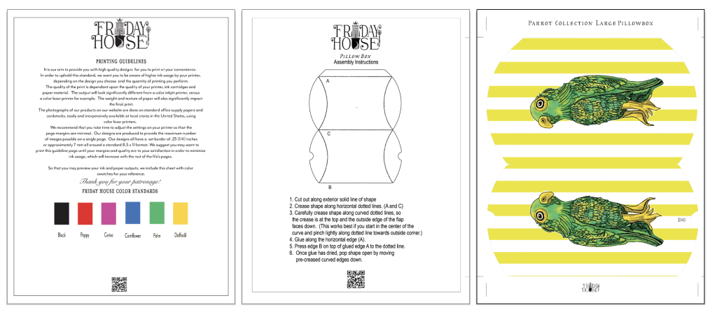 It’s very convenient to have a few pillow boxes on hand when it comes to small gift giving. We adapted our Parrot Collection patterns to these larger pillowbox shapes. The Pillowbox measures 4 7/8″ x 4 1/8″ . Easy to follow assembly instructions are included, and there is also a video tutorial for how to assemble the pillow box form. We recommend printing these on card stock weight paper.