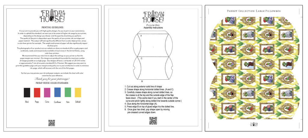 It’s very convenient to have a few pillow boxes on hand when it comes to small gift giving. We adapted our Parrot Collection patterns to these larger pillowbox shapes. The Pillowbox measures 4 7/8″ x 4 1/8″ . Easy to follow assembly instructions are included, and there is also a video tutorial for how to assemble the pillow box form. We recommend printing these on card stock weight paper.