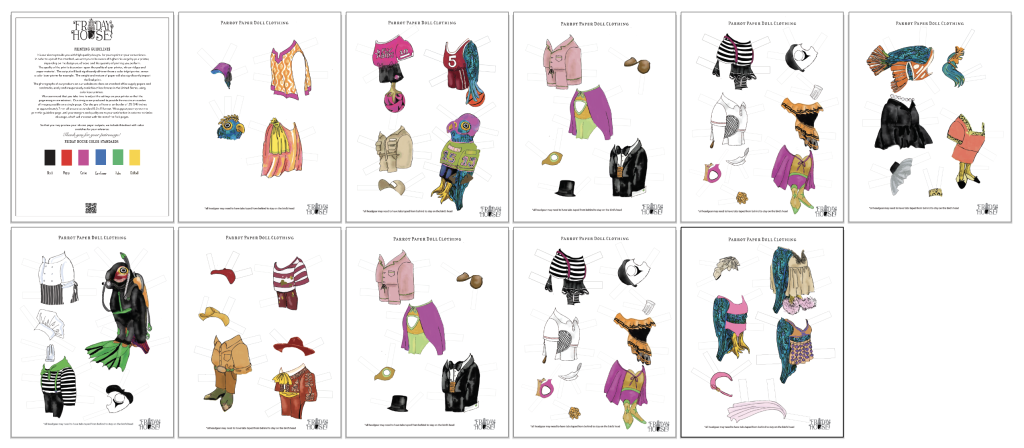 Illustrations of clothing for Parrot Paper Dolls in pairs. Available in several different colors. Paper Dolls are also available in a separate file.