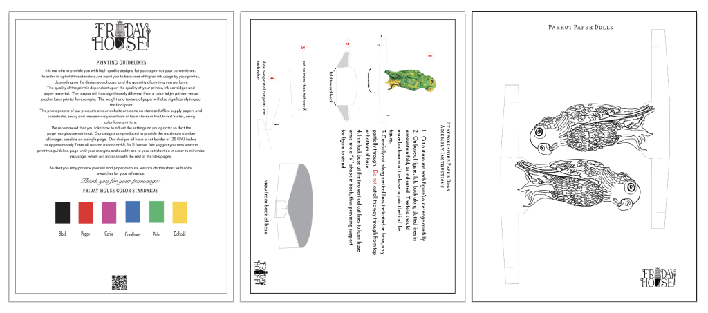 I love Sancai Parrots, which are antique earthenware parrots made in China and often used in temples to hold incense. Like the Staffordshire Dogs in our collection, I find it very amusing to draw statues and turn them into paper dolls. I tried drawing the parrots a few times, but was not happy with the results and so I let it rest. Then one night, it just happened very quickly, and for about a week, it was kind of parrot mania around here. My mother really enjoys them, and I find that to be a wonderful thing. The Parrot Paper Dolls come in three colors plus one line drawing you can color or decorate as you like. There are separate files of clothing for each colored Parrot. We hope you enjoy these and they bring you a little lift.