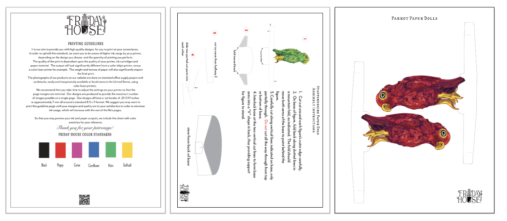 I love Sancai Parrots, which are antique earthenware parrots made in China and often used in temples to hold incense. Like the Staffordshire Dogs in our collection, I find it very amusing to draw statues and turn them into paper dolls. I tried drawing the parrots a few times, but was not happy with the results and so I let it rest. Then one night, it just happened very quickly, and for about a week, it was kind of parrot mania around here. My mother really enjoys them, and I find that to be a wonderful thing. The Parrot Paper Dolls come in three colors plus one line drawing you can color or decorate as you like. There are separate files of clothing for each colored Parrot. We hope you enjoy these and they bring you a little lift.