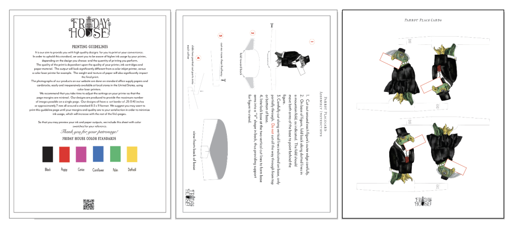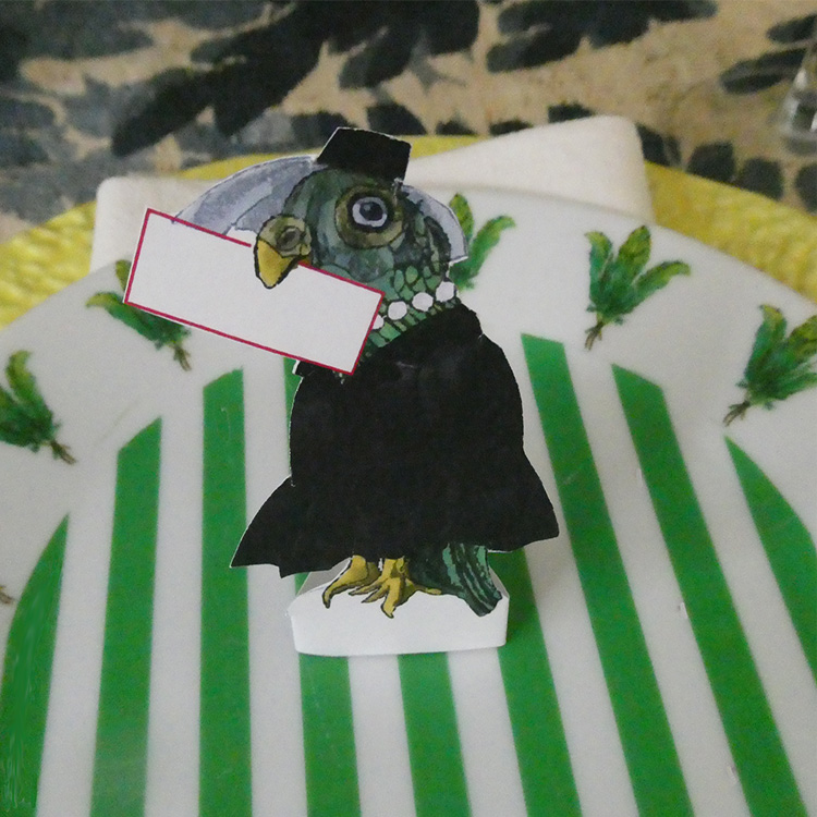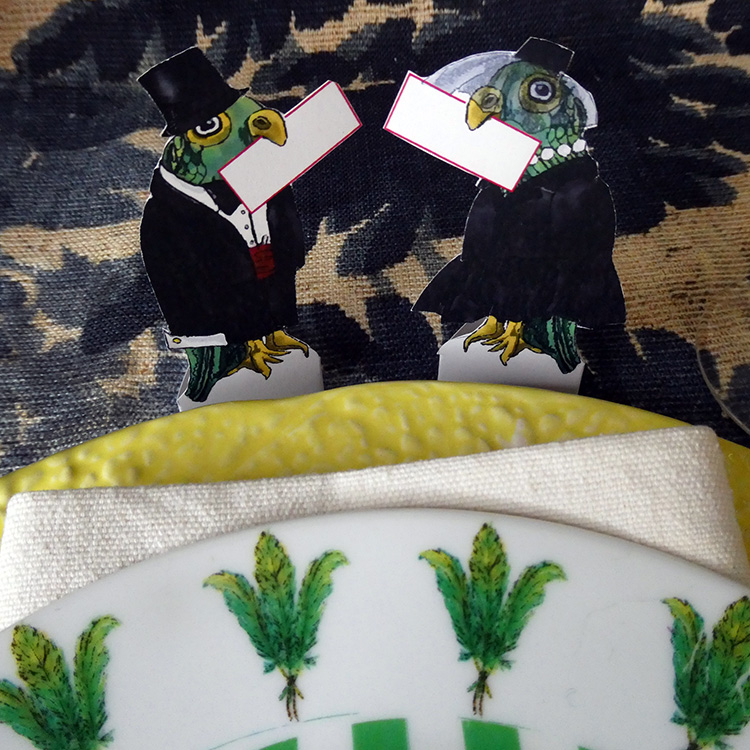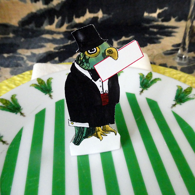 Amusingly clothed parrots, taken from our Parrot Paper Dolls have been reduced in size, with a blank card in their beaks, to function as charming place cards, buffet cards, tags, labels, etc. Available in various delightful costumes.