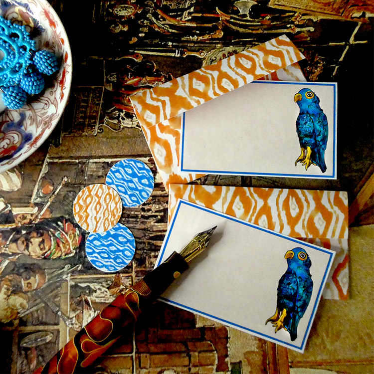 Ikat patterned 5×7 note cards in several cheerful colors with coordinating e make for a chic addition to your desk.