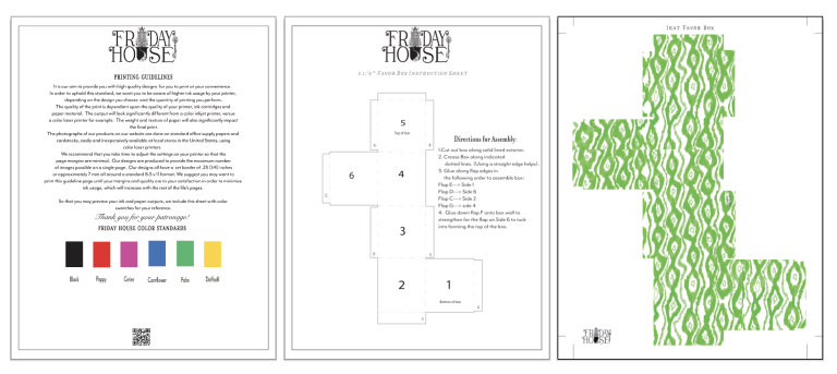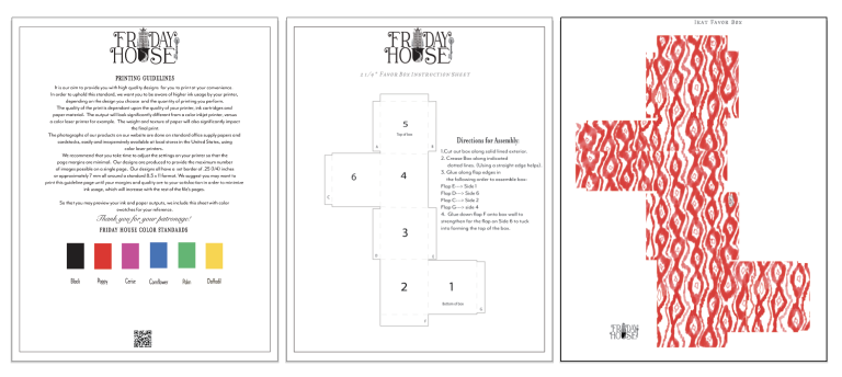 Our sweet little 2.25″ square favor boxes are available in a variety of patterns and colors. We suggest printing on cardstock and include easy assembly instructions or watch the tutorial video.